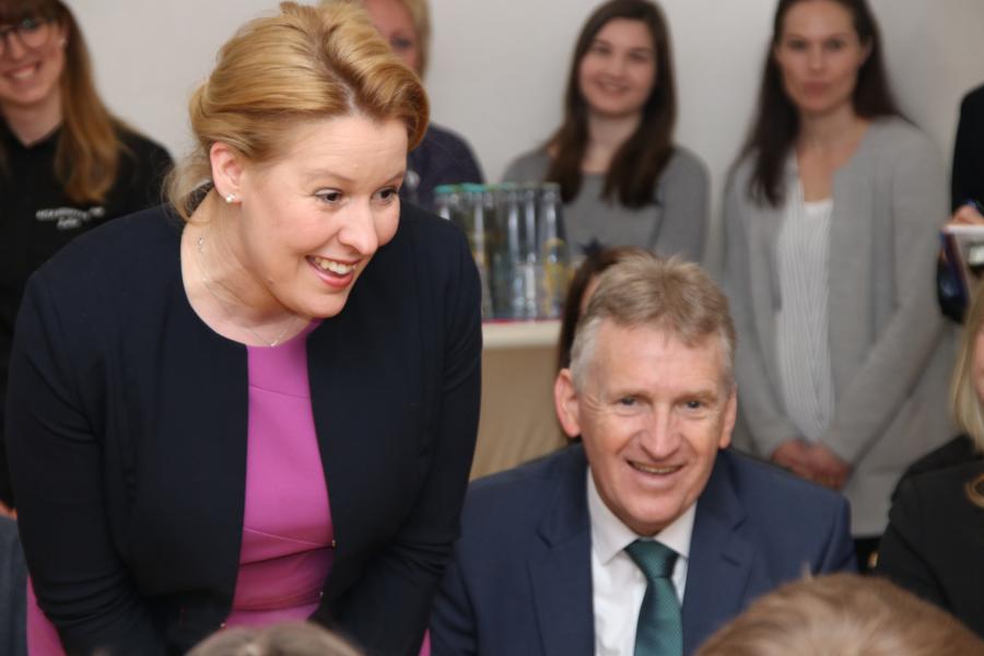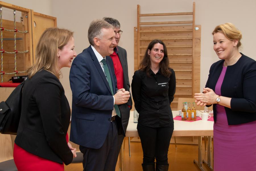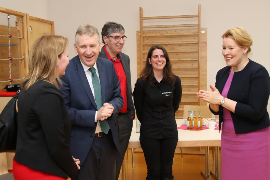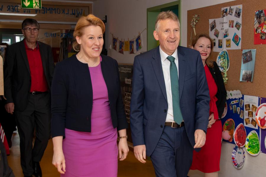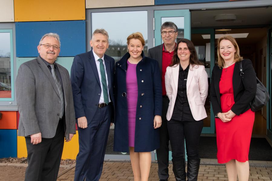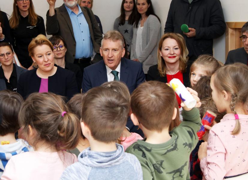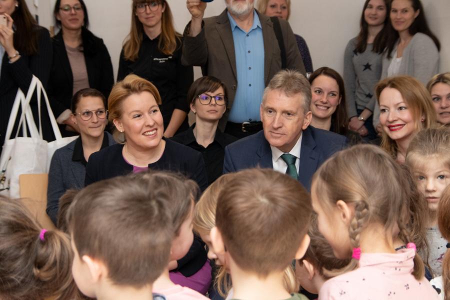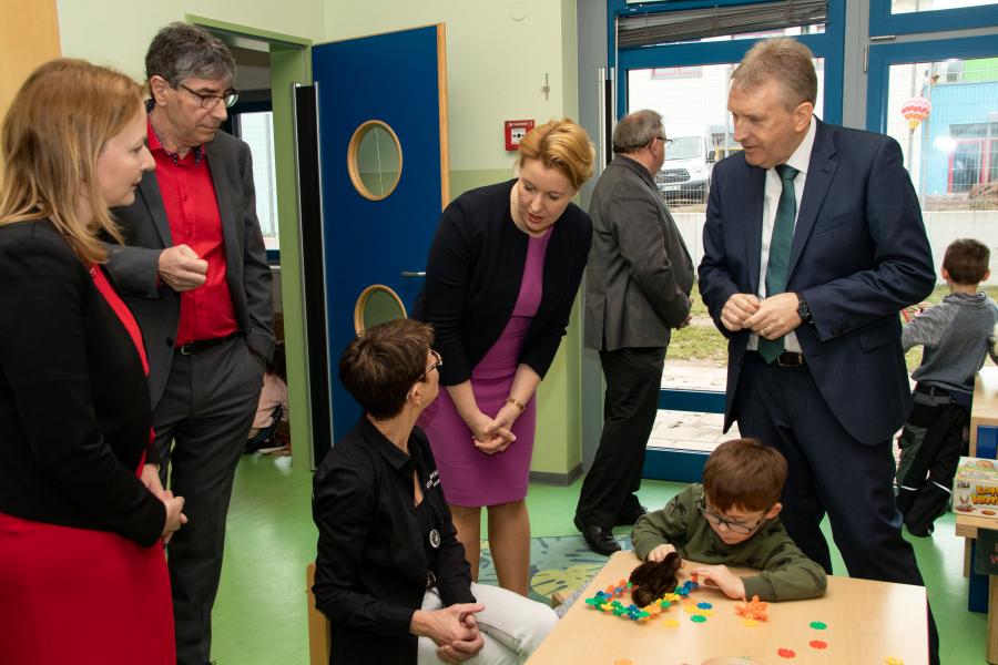 Bundesfamilienministerin Franziska Giffey besucht Vorzeige-Kita KinderlandMärz 2019: Hoher Besuch im Landkreis Saarlouis: Die Bundesministerin für Familie, Senioren, Frauen und Jugend, Franziska Giffey, hat die Kita-Kinderland-Einrichtung in Saarwellingen besucht und dem Landkreis dabei eine sehr gute Arbeit bescheinigt. Denn die Kita-Kinderland hat ein ganz spezielles Angebot, insbesondere für Eltern, die aufgrund ihres Berufs auf Betreuungen in den Randzeiten angewiesen sind. Entstanden ist Kinderland als Einrichtung des Landkreises vor 9 Jahren, als klar wurde, dass der Bedarf an geeigneten Plätzen in der Region steigt. Von 5 Uhr in der Früh bis 23 Uhr am Abend ist Kinderland seitdem geöffnet, montags bis samstags und ohne Schließzeiten in den Sommerferien. Ein Grund für die Bundesfamilienministerin, sich die Kita und ihr Team einmal genauer anzuschauen. Vor Ort angekommen, hießen Landrat Patrik Lauer, die saarländische Bildungsstaatssekretärin Christine Streichert-Clivot und das Team der Einrichtungsleitung, Ralf Weber und Maren Jung, die Bundesministerin herzlich willkommen. Beim Rundgang durch das Haus betonte Franziska Giffey die Wichtigkeit eines flexiblen Betreuungsangebotes für die Vereinbarkeit von Familie und Beruf: „Wir brauchen bedarfsgerechte Öffnungszeiten, weil wir sehen, dass immer mehr Eltern sich das wünschen. Dabei geht es nicht darum, dass Kinder von morgens bis abends betreut werden. Die Angebote in den Kindertagesstätten müssen zum Bedarf der Eltern passen. Die Kita-Kinderland Einrichtung in Saarwellingen ist deshalb ein tolles Vorzeigeprojekt.“ Kombiniert wird das flexible Angebot von Kinderland mit einem eigenen pädagogischen Ansatz, der sich ganz nach den Bedürfnissen der Kinder richtet, erklärte die pädagogische Leiterin Maren Jung. Das findet Anklang: „Die Nachfrage im Landkreis ist riesig. Unser dritter Standort steht kurz vor der Eröffnung. Ab dann werden 260 Kinder bei uns betreut und das vierte Kinderland ist schon in Planung,“ freut sich der Landrat. Vergeben werden die Kita-Plätze nur bei nachgewiesenem Bedarf und auch die maximale Betreuungszeit ist, wie bei Kitas üblich, auf maximal 10 Stunden begrenzt. Der Arbeitgeber zahlt dabei einen Anteil der Betreuungskosten. So gibt es beispielsweise feste Kooperationen mit den angrenzenden Ford-Werken, der Bundeswehr, dem DRK und weiteren Arbeitgebern, die für Kinder ihrer Belegschaft Plätze finanzieren. Besonders ist außerdem, dass sich auch alle 13 Städte und Gemeinden des Landkreises an der Finanzierung von Kinderland im gesetzlichen Rahmen für die jeweils belegten Plätzen beteiligen.