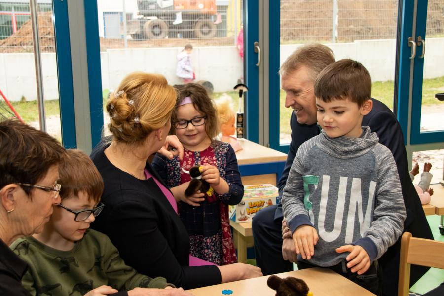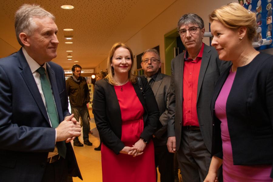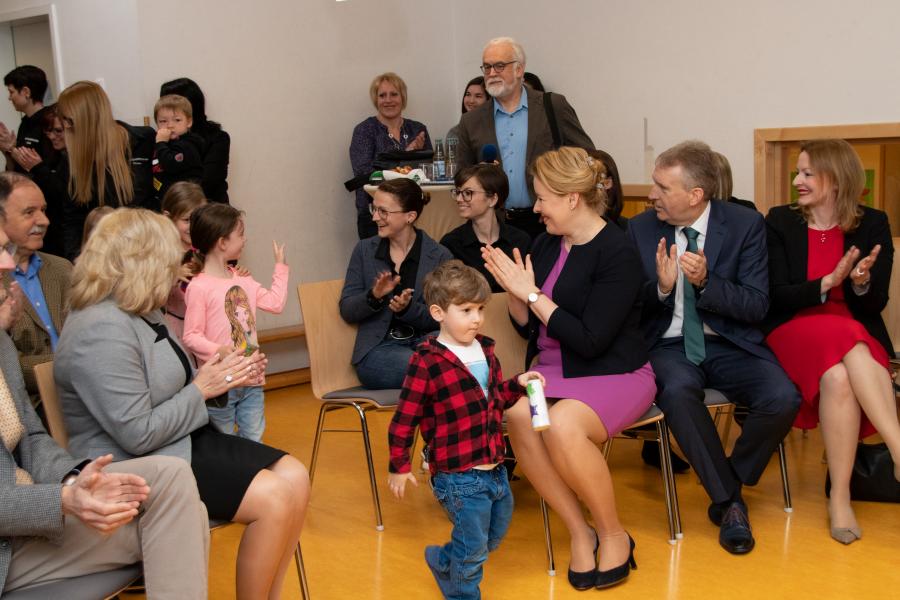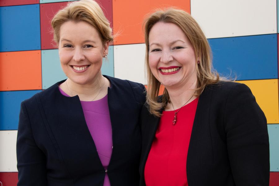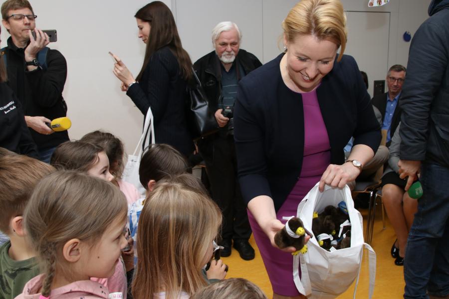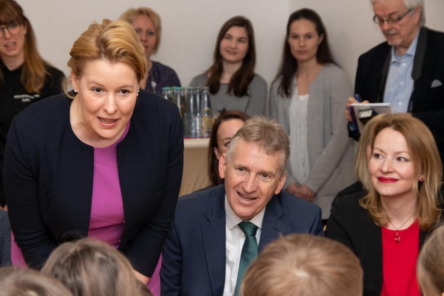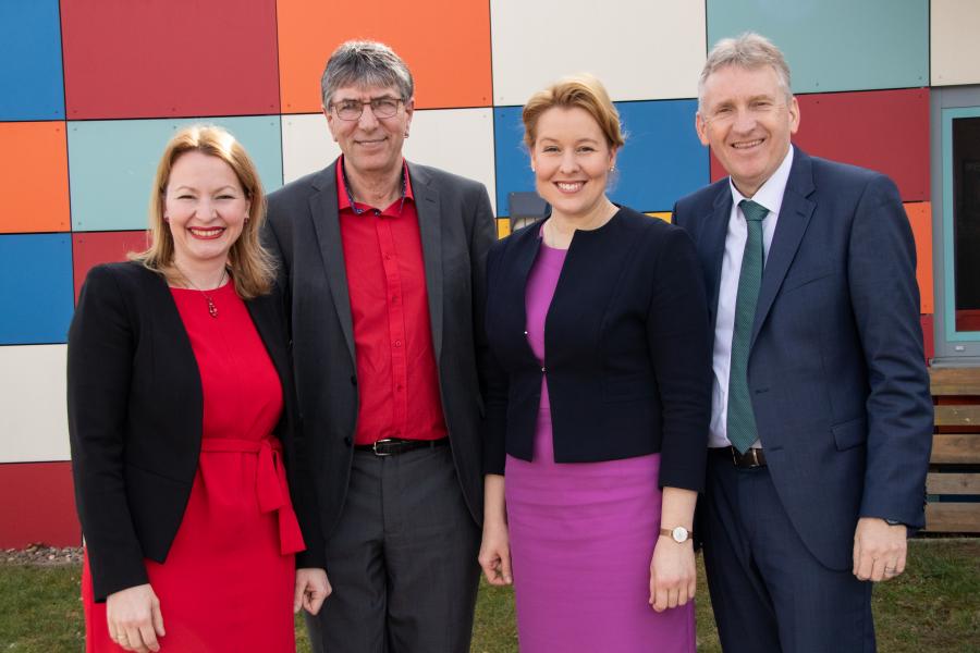 Bundesfamilienministerin Franziska Giffey besucht Vorzeige-Kita KinderlandMärz 2019: Hoher Besuch im Landkreis Saarlouis: Die Bundesministerin für Familie, Senioren, Frauen und Jugend, Franziska Giffey, hat die Kita-Kinderland-Einrichtung in Saarwellingen besucht und dem Landkreis dabei eine sehr gute Arbeit bescheinigt. Denn die Kita-Kinderland hat ein ganz spezielles Angebot, insbesondere für Eltern, die aufgrund ihres Berufs auf Betreuungen in den Randzeiten angewiesen sind. Entstanden ist Kinderland als Einrichtung des Landkreises vor 9 Jahren, als klar wurde, dass der Bedarf an geeigneten Plätzen in der Region steigt. Von 5 Uhr in der Früh bis 23 Uhr am Abend ist Kinderland seitdem geöffnet, montags bis samstags und ohne Schließzeiten in den Sommerferien. Ein Grund für die Bundesfamilienministerin, sich die Kita und ihr Team einmal genauer anzuschauen. Vor Ort angekommen, hießen Landrat Patrik Lauer, die saarländische Bildungsstaatssekretärin Christine Streichert-Clivot und das Team der Einrichtungsleitung, Ralf Weber und Maren Jung, die Bundesministerin herzlich willkommen. Beim Rundgang durch das Haus betonte Franziska Giffey die Wichtigkeit eines flexiblen Betreuungsangebotes für die Vereinbarkeit von Familie und Beruf: „Wir brauchen bedarfsgerechte Öffnungszeiten, weil wir sehen, dass immer mehr Eltern sich das wünschen. Dabei geht es nicht darum, dass Kinder von morgens bis abends betreut werden. Die Angebote in den Kindertagesstätten müssen zum Bedarf der Eltern passen. Die Kita-Kinderland Einrichtung in Saarwellingen ist deshalb ein tolles Vorzeigeprojekt.“ Kombiniert wird das flexible Angebot von Kinderland mit einem eigenen pädagogischen Ansatz, der sich ganz nach den Bedürfnissen der Kinder richtet, erklärte die pädagogische Leiterin Maren Jung. Das findet Anklang: „Die Nachfrage im Landkreis ist riesig. Unser dritter Standort steht kurz vor der Eröffnung. Ab dann werden 260 Kinder bei uns betreut und das vierte Kinderland ist schon in Planung,“ freut sich der Landrat. Vergeben werden die Kita-Plätze nur bei nachgewiesenem Bedarf und auch die maximale Betreuungszeit ist, wie bei Kitas üblich, auf maximal 10 Stunden begrenzt. Der Arbeitgeber zahlt dabei einen Anteil der Betreuungskosten. So gibt es beispielsweise feste Kooperationen mit den angrenzenden Ford-Werken, der Bundeswehr, dem DRK und weiteren Arbeitgebern, die für Kinder ihrer Belegschaft Plätze finanzieren. Besonders ist außerdem, dass sich auch alle 13 Städte und Gemeinden des Landkreises an der Finanzierung von Kinderland im gesetzlichen Rahmen für die jeweils belegten Plätzen beteiligen.