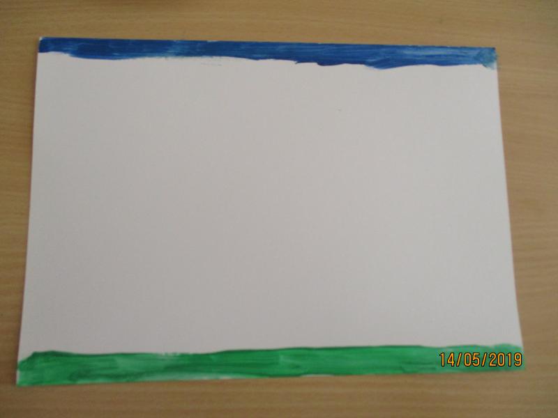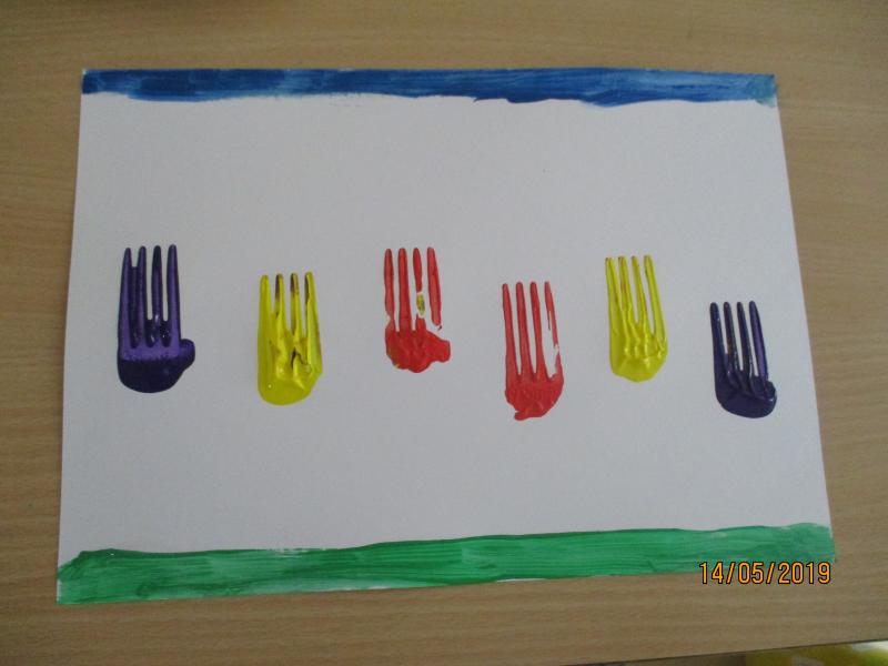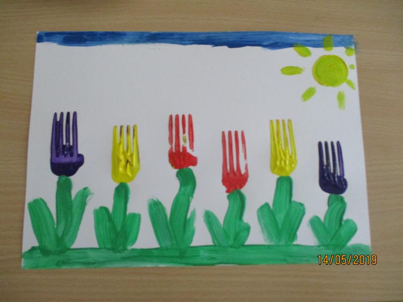 Ich habe Euch unten ein paar Fotos beigefügt, die Euch bei den einzelnen Schritten helfen sollen. Und schon gehts los: Ich habe mir vorab mit dem Pinsel einen blauen Himmel und eine grüne Wiese gemalt. Nun sollen auf meine Wiese schöne bunte Blumen wachsen. Dafür tauche ich den Gabelkopf in die Farbe und rolle ihn ab, sodass er komplett mit Farbe bestrichen ist. Mit der Gabel rolle ich die Farbe auf meinem Blatt wieder ab. Fertig! Schaut auf den Fotos, wie schön es aussieht. Ihr könnt Euren Blumen noch Stängel und Blätter mit dem Pinsel oder den Fingern malen. Ich wünsche euch viel Spaß beim Ausprobieren. Übrigens…die Farbe lässt sich sehr gut mit Wasser und Spülmittel säubern. Viele Grüße von Anni aus Haus 3 Daten & Fakten