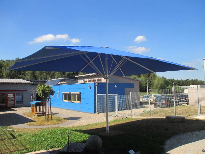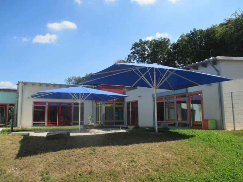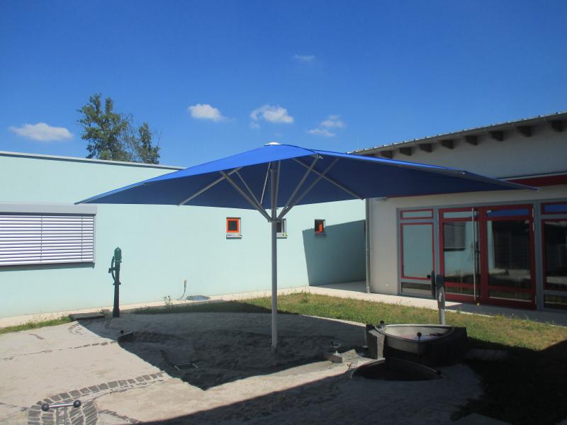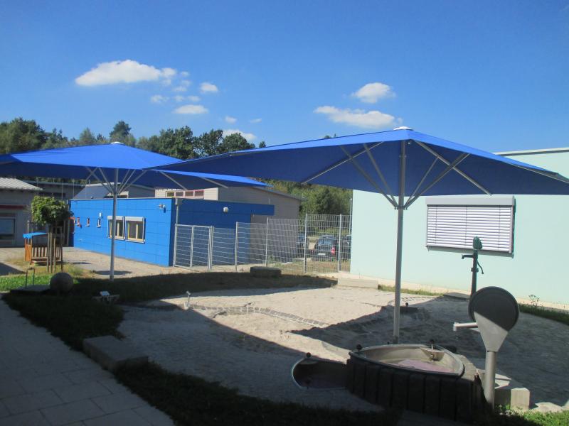 Wenn es auch die Kinder nicht mit leuchtenden Augen quittieren, so sind aber die Erziehrinnen und Eltern heil froh mit der neuen Beschattung auf unserer Wasserspiellandschaft! Dank der Spende von rund 2500 € konnte Kinderland sich zwei dieser riesigen Marktschirme leisten. Nun haben wir ausgiebig Schutz und der nächste heiße Sommer kann kommen. Wir freuen uns schon jetzt...