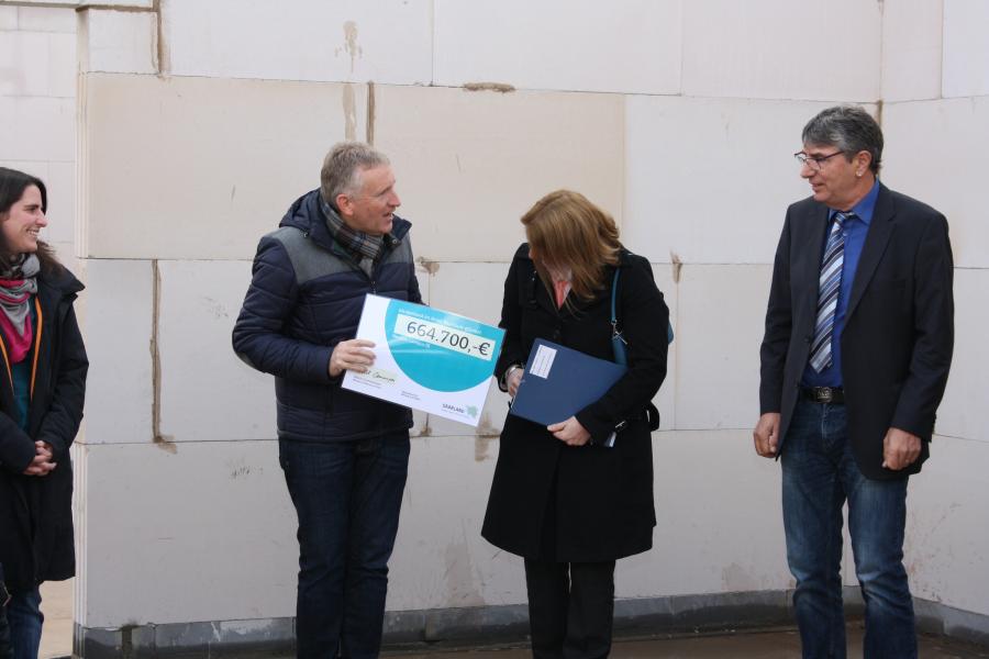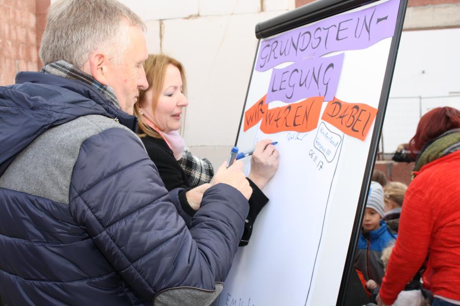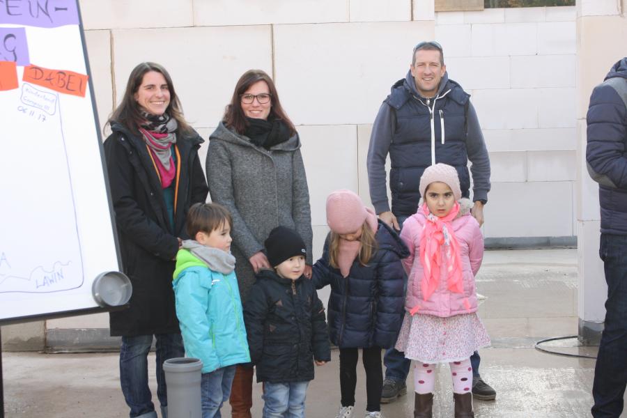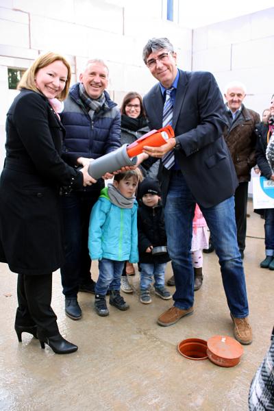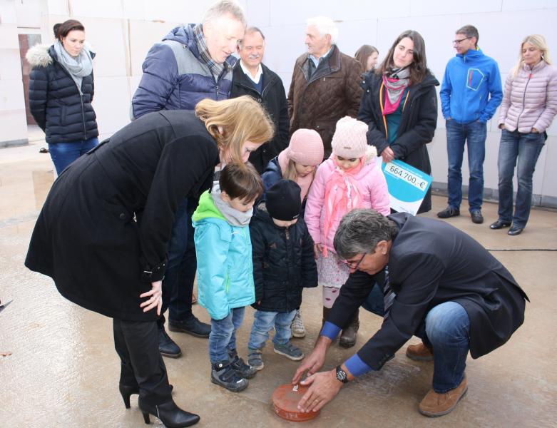 Foto: Zeitkapsel für spätere Generationen versenkt: Bei der Grundsteinlegung zu Kinderland III begehen Landrat Patrik Lauer (hinten links), Bildungsstaatssekretärin Christine Streichert-Clivot (links), Kinderland-Geschäftsführer Ralf Weber (rechts) gemeinsam mit Maren Jung, pädagogische Gesamtleitung und vielen Gästen eine schöne Tradition. (Foto: Landkreis Saarlouis/ Lara Kühn) November 2017 Daten & Fakten
