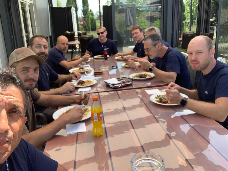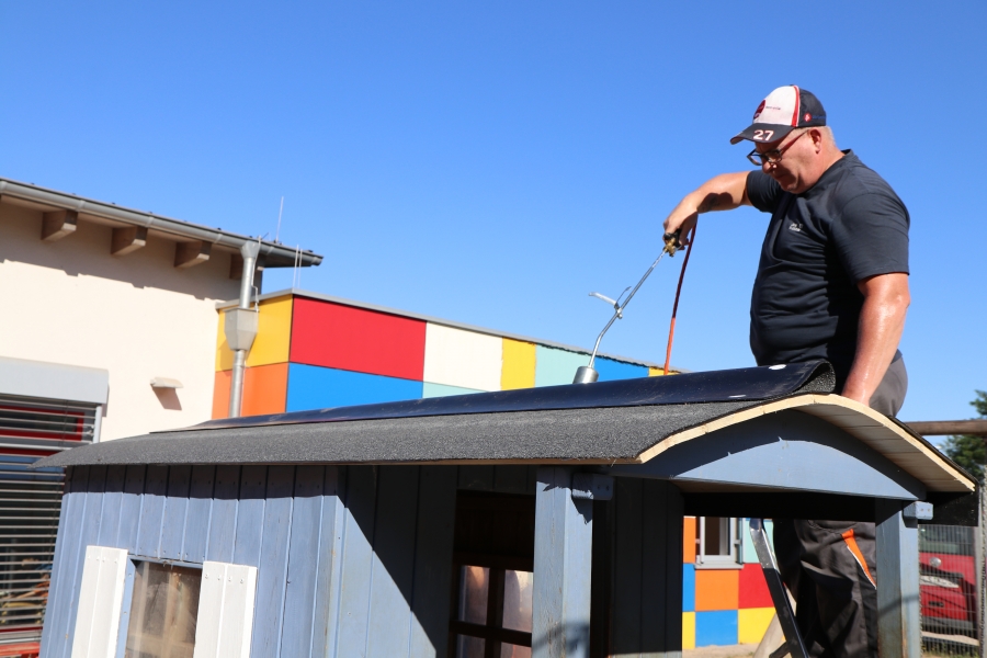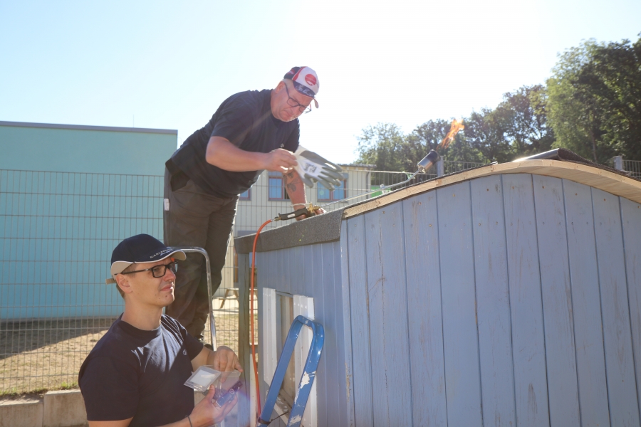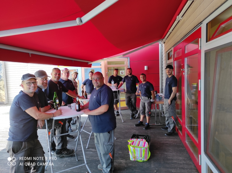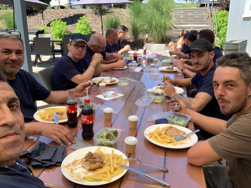 Für uns war es das „Rund-um-Sorglospaket“ und Kinderland musste nur noch für das leibliche Wohl der ausgeliehenen Mitarbeiter sorgen. Dabei wurden wir von Rettels Partyservice aus Saarwellingen unterstützt. Vielen Dank für den gemütlichen Platz zum Essen im großen Kreisel – mit großen Stühlen und großen Tischen (die langen Beine der Arbeiter hätten auch nur schwer unter die kleinen Tische in der Cafeteria der Kita gepasst…).