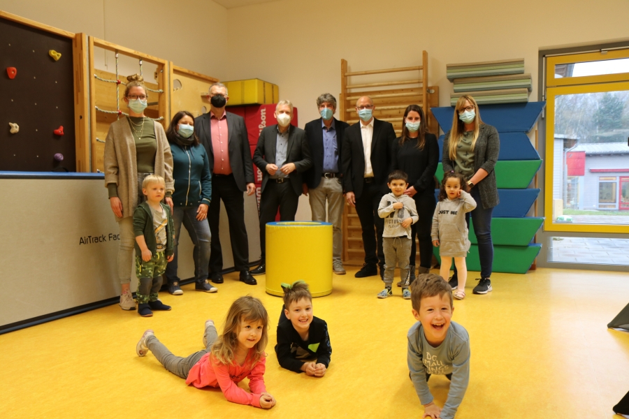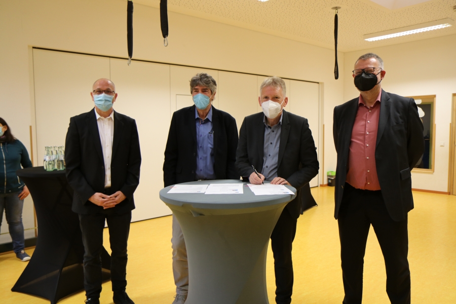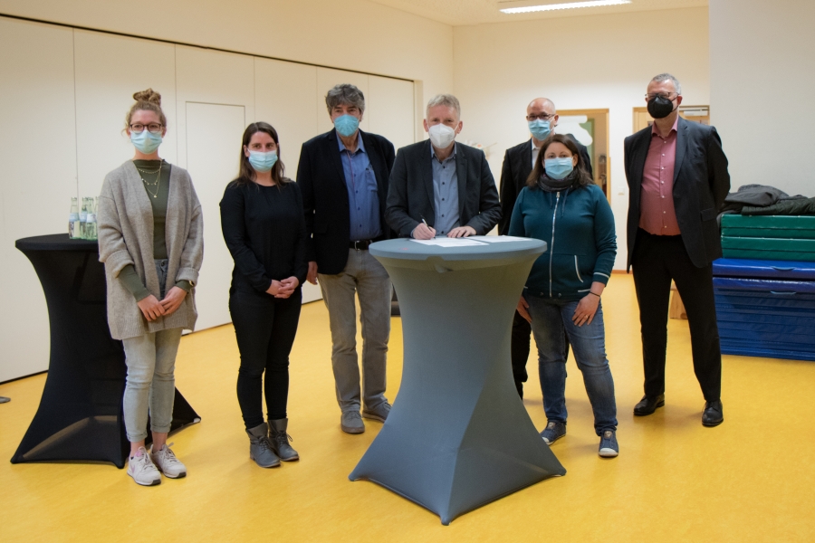 Vertragsverlängerung Fordwerke GmbH und KinderlandRund 20 Familien bzw. Mitarbeiter*innen der Fordwerke GmbH nutzen mit finanzieller Unterstützung ihres Arbeitgebers einen Platz mit erweiterteten Öffnungszeiten für ihre Früh- und Mittagschicht im Kinderland im Campus II. Nun können sich diese und zukünftige Familien über eine weitere Vertragsverlängerung bis 30.06.2025 freuen. Am 30.03.2022 trafen sich der Aufsichtsratsvorsitzende Herr Landrat Lauer, der Personalleiter der Fertigung Saarlouis Herr Fehling und der Geschäftsführer von Kinderland Herr Weber in der Halle der Kita für den, zugegeben diesmal sehr klein gehaltenen, feierlichen Akt der Vertragsunterzeichung. Unterstützt wurden sie dabei durch den Betriebsrat der Ford, die Leitungen von Kinderland und vor allem durch die "Ford-Kinder". Die wissen natürlich auch schon alle "die Mama (oder der Papa) arbeitet bei Ford".