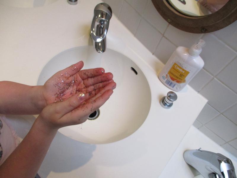 Warum muss ich Hände waschen - ein ExperimentLiebe Kinder, bestimmt stellt Ihr Euch viele Fragen über das Corona Virus und warum Ihr Euch jetzt so oft und so lange, mindestens 20 Sekunden, mit Seife Eure Hände waschen sollt. Vielen Kindern fällt es schwer, so lange mit Seife die Hände zu waschen und sie verstehen den Sinn dahinter vielleicht noch nicht so richtig. Deswegen haben wir uns gedacht, dass wir dieses Thema aufgreifen und versuchen, es kindgerecht zu erklären. Natürlich soll das Ganze auch ein wenig Spaß machen. Daher ein großartiges Experiment: Schaut mal hier: bitte die Fotos unten beachten und im Download findet Ihr nochmal alles auf einen Blick zum ausdrucken! Stell Dir vor, Du hustet in Deine Hände. Dort haften nun die Viren. Wenn Du Deine Hände danach nicht wäschst und weiterspielst, überträgst Du die Viren auch auf alle anderen Oberflächen und Spielzeuge. Die Viren haften auf dem Stift, mit dem du malst und auch auf den Spielsachen. Wenn wir uns die Hände reichen, haften diese sogar auf den Handflächen des anderen. Wir wollen die Viren nicht weiterverbreiten. Also müssen die Hände gründlich gewaschen werden. Im nächsten Schritt sehen wir, was passiert, wenn wir unsere Hände waschen: Lass uns gemeinsam schauen und dabei ein kleines Experiment durchführen. Zu dem Experiment benötigen wir folgende Sachen: